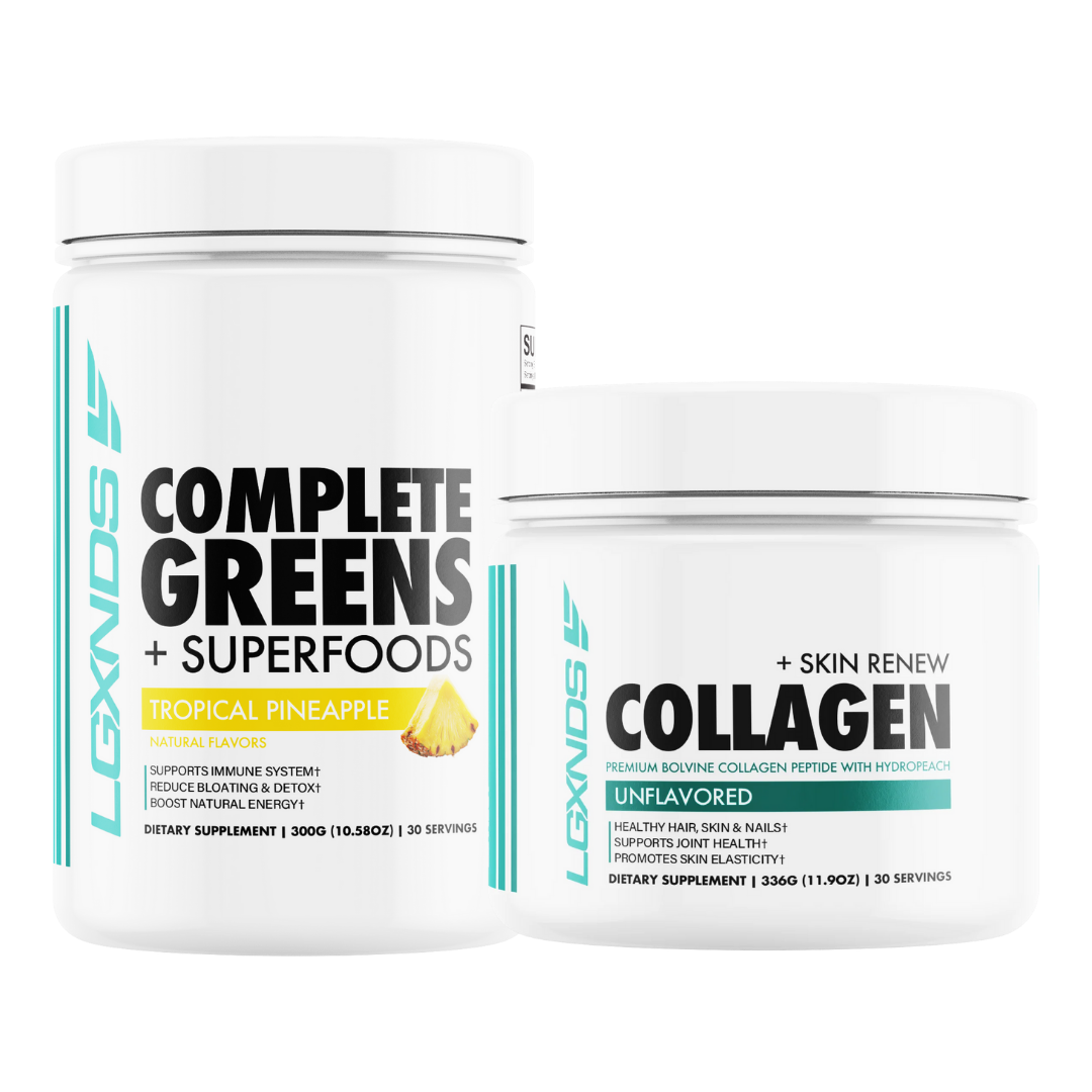 A complete inside-out wellness bundle combining LGXNDS Complete Greens + Superfoods with Collagen + Skin Renew. Designed to optimize digestion, immunity, skin health, joint strength, and recovery, this powerful duo fuels your body with nutrient-dense organic greens, multi-source collagen peptides, probiotics, enzymes, and HydroPeach® ceramides. Experience a healthier gut, stronger tissues, and glowing skin.